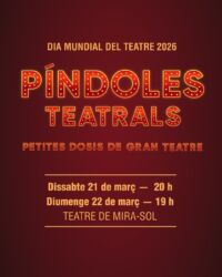 El sábado 21 y el domingo 22 de marzo, Sant Cugat celebrará el Día Mundial del Teatro con una nueva edición de “Píldoras teatrales” . La propuesta es fruto de un proyecto participativo impulsado por la Mesa de Artes Escénicas en colaboración con el Ayuntamiento. El espectáculo constará de cinco piezas breves de compañías locales amateurs y que tendrán una duración de aproximadamente 15 minutos cada una. La actuación tendrá lugar en el Teatre Mira-sol y se prevé que tendrá una duración de 100 minutos.